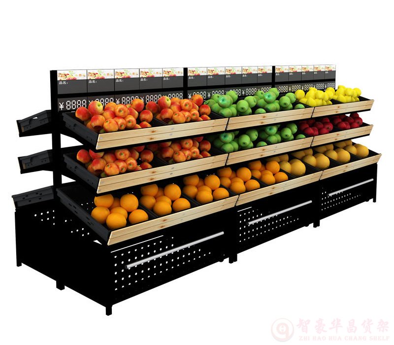 受制于店面面積,選擇陳列面較大的多層蔬果架是很有必要,市面上常見的蔬果架一般為單層或者兩層形式,單層的成都蔬果架由于陳列面小、商品展示少,不推薦過多使用,可以考慮在中島區(qū)域使用單層的蔬果架,作為促銷臺(tái)使用。單面貨架建議選擇雙層或者三層蔬果貨架。